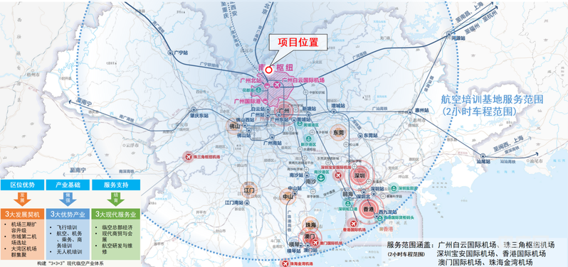 广州作为中国南方核心交通枢纽,正通过航空、航运、铁路及城市轨道的全方位建设,着力打造连接全球、辐射全国的枢纽。项目位于“空铁联运”规划核心圈层,结合白云机场三期扩建工程,加快航空培训产业布局建设,完善航空产业链条,构建“3+3+3”现代临空产业体系。